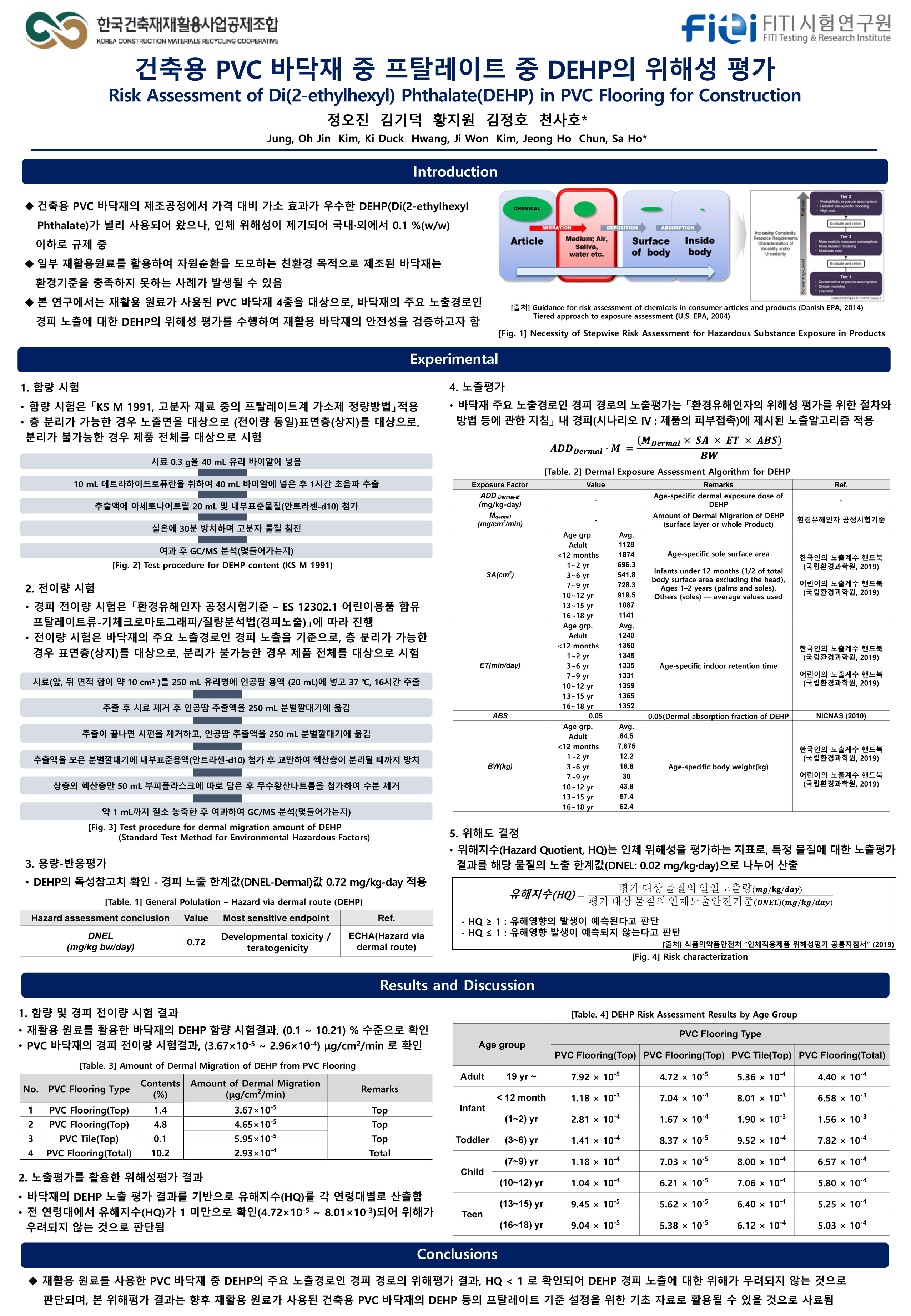 본 연구는 재활용 원료가 활용된 PVC 바닥재의 안전성 검증을 목적으로 수행되었으며, DEHP(디에틸헥실 프탈레이트)의 함량·경피 전이량·연령대별 위해지수(HQ)를 종합적으로 평가하였습니다.